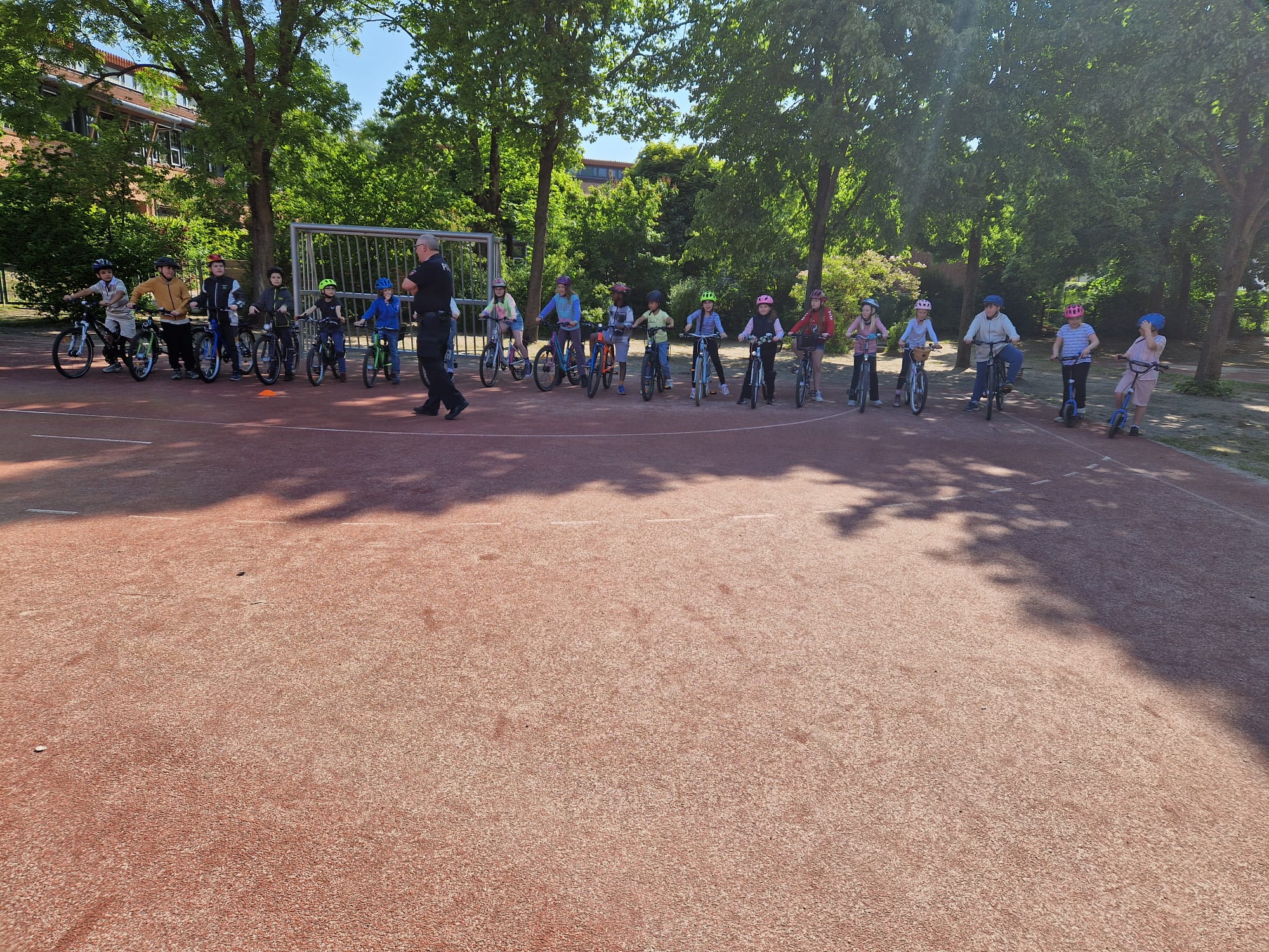 Am 23. Juni 2025 fand dann die Fahrradprüfung für die 4. Klassen statt. Zuerst wurden die Fahrräder von der Polizei auf Verkehrssicherheit überprüft. Anschließend ging es für die Kinder an die praktische Radfahrprüfung. Sie sollten zeigen, dass sie sich sicher im Realraum mit ihrem Rad bewegen können und bestimmte Techniken wie z.B. das richtige Anfahren, nach links und rechts abbiegen sowie das Umfahren von Hindernissen beherrschen.