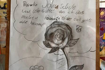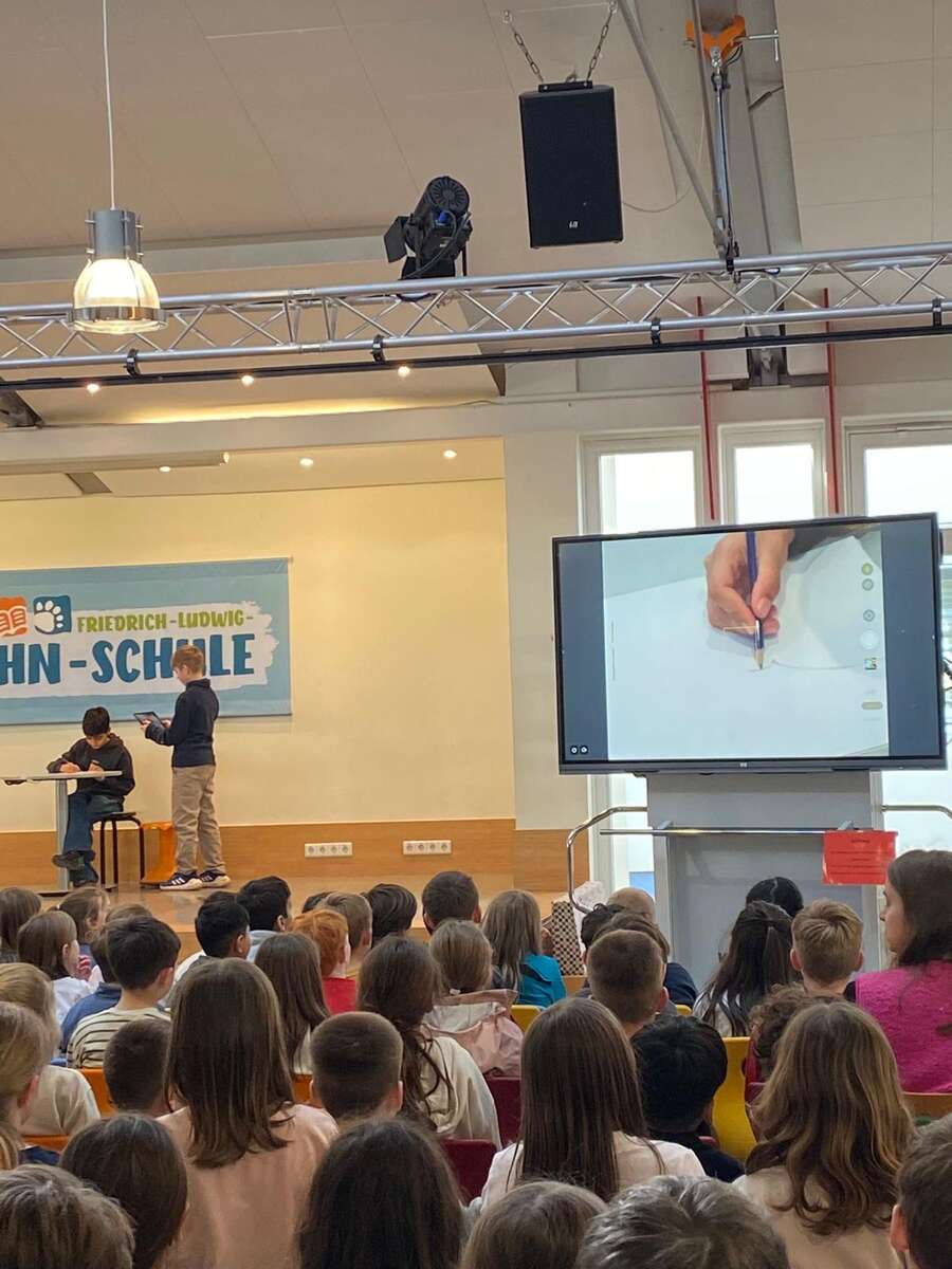 Eine ganz andere Stimmung zaubert dahingegen ein Junge aus der 4. Klasse auf die Bühne und in die Aula. Sein Talent ist das Zeichen. Er sitzt ganz allein auf der Bühne vor einem weißen Blatt Papier; es erklingen ruhige Töne eines Klavierstückes und untermalen seine ersten Bleistiftstriche auf dem Papier. Das Publikum hält gespannt den Atem an und beobachtet staunend und mucksmäuschenstill, wie ein kleines Kunstwerk entsteht. Er bleibt während der gesamten Aufführungen auf der Bühne im Hintergrund sitzen und zeichnet. Am Ende des Forums dürfen alle noch einmal einen Blick auf sein Bild werfen: eine wunderschöne Rose ist entstanden, die fast so aussieht, als könnte man sie aus dem Bild heraus in die Hand nehmen. Das Forum hat allen sehr gut gefallen und die Jahnis sind gespannt, was es beim nächsten Mal zum Bestaunen gibt.